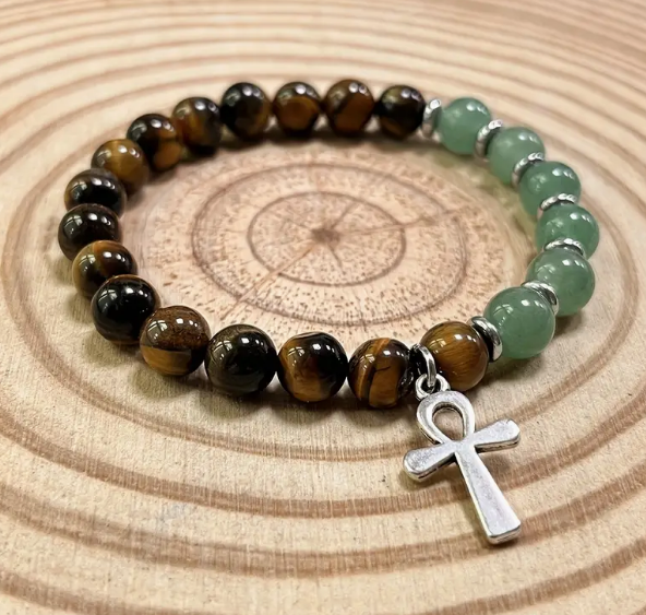 Braccialetto elastico con pietre naturali occhio di tigre e avventurina, pendente croce di Ankh