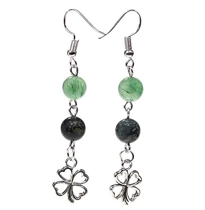 Eleganti orecchini realizzati con Diaspro kambaba e Avventurina verde, con trifoglio fortunato.